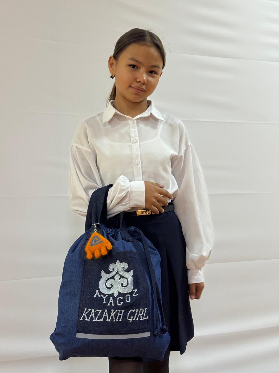 Рюкзак выполнен из джинсовой ткани и украшен традиционными казахскими орнаментами. Изделие лёгкое, прочное и удобное для ежедневного использования. Карманы расположены так, чтобы школьнику было комфортно хранить учебные принадлежности, а сам дизайн гармонирует со школьной формой.