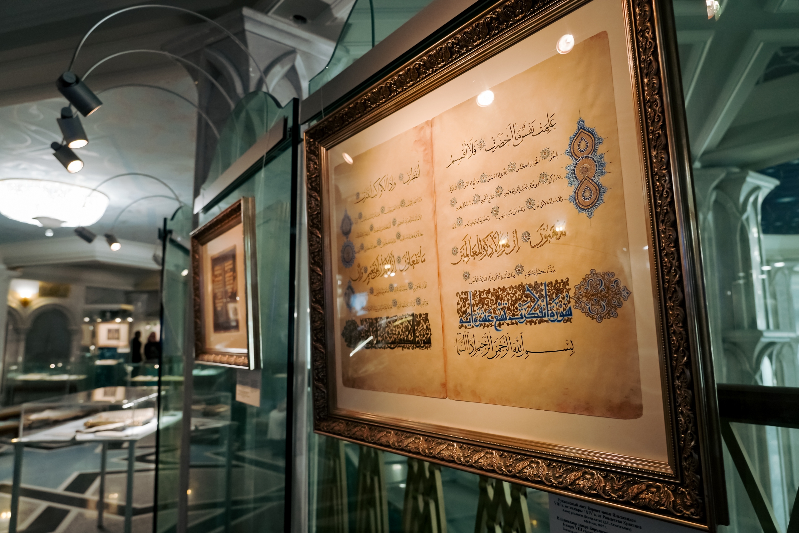 В экспозиции представлен 51 рукописный лист Корана: это точные реплики, созданные художником-реставратором Дамиром Ахматгалиевым с оригиналов VII–XIX веков из музейных и библиотечных собраний России, Европы, Азии и Африки. Помимо этого выставлены реплики с таких редких рукописей, как «Голубой Коран», Коран халифа Усмана, османские и сефевидские списки, а также полный текст Корана на одном листе. Особенно удивит современников поразительное разнообразие каллиграфических стилей: хиджази, куфи, магриби, андалуси, насх, мухаккак, сульс, бихари, сини, дагестанский насх и другие.