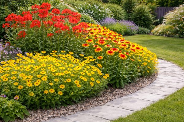 Третий проверенный вариант — кореопсис. Лёгкий, воздушный, с множеством ярко-жёлтых цветков, он создаёт эффект непрерывного цветения. Высота 50–80 см, цветёт с июня до сентября. Отличается высокой морозостойкостью (до –30 °C) и может расти 5 лет и более без пересадки. Особенно красиво смотрится в природных композициях и «луговых» цветниках.