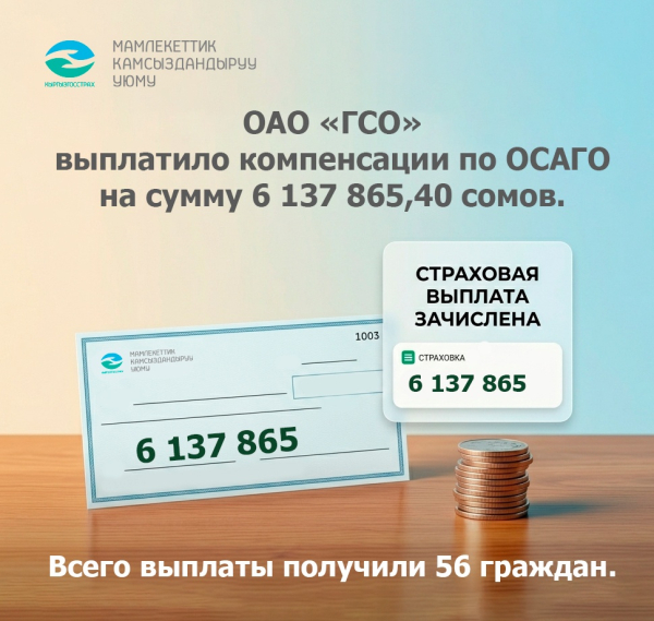 ОАО "Государственная страховая организация" (ГСО) подвело итоги выплат по обязательному страхованию гражданско-правовой ответственности владельцев автотранспортных средств (ОСАГО). Общая сумма компенсаций составила 6 137 865 сомов.