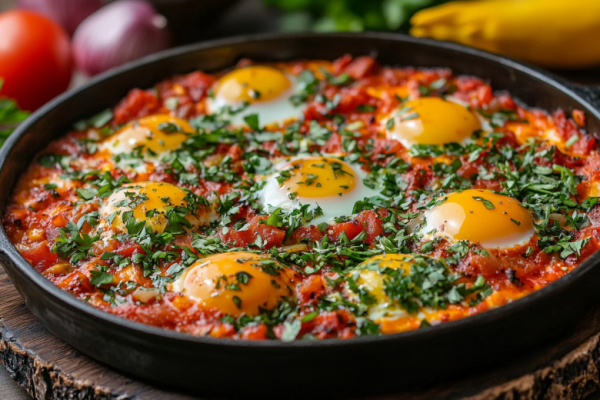 Рецепт: помидоры нарежьте крупными кубиками или дольками. В сковороде разогрейте масло, выложите помидоры и жарьте на среднем огне 5-7 минут, пока они не пустят сок и не станут мягкими. Добавьте мелко рубленый чеснок, соль и перец, перемешайте и прогрейте ещё минуту. Ложкой сделайте в томатной массе небольшие углубления по количеству яиц. Аккуратно вбейте в каждое углубление по яйцу. Накройте сковороду крышкой и готовьте на медленном огне 5-7 минут. Снимите с огня, посыпьте свежей рубленой зеленью и подавайте прямо в сковороде с кусочком хрустящего хлеба для макания.