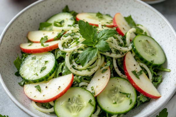 Весна пришла — за 5 минут готовлю салат «Газапхули» с яблочком, огурцом и самой сочной заправкой. Беру свежий огурец, зелёное яблоко и ароматную зелень — и создаю лёгкий, витаминный салат, идеальный для поста или как освежающее дополнение к любому блюду. Это гениально простое и невероятно вкусное блюдо, которое готовится быстрее, чем вы сварите макароны. Его необычность в том, что кисло-сладкое яблоко и хрустящий огурец в компании чеснока и лимонного сока создают тот самый весенний, пробуждающий вкус. Получается обалденная вкуснятина: сочная, хрустящая, с лёгкой кислинкой и пикантной ноткой чеснока. Салат идеально подходит к шашлыку, жареной картошке или просто как самостоятельная закуска.