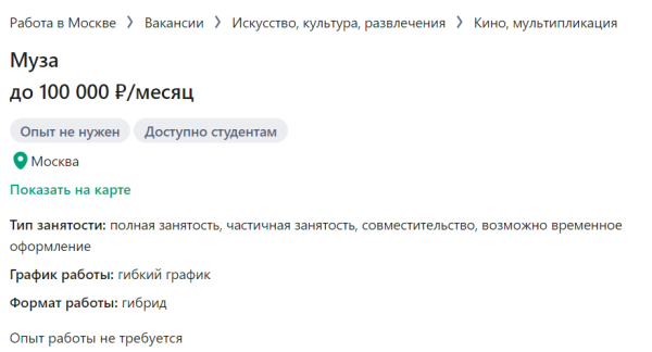 Московский музыкант ищет музу на рекрутинговом сервисе SuperJob и готов платить 100 тыс. рублей в месяц, если она будет вдохновлять на творчество.
