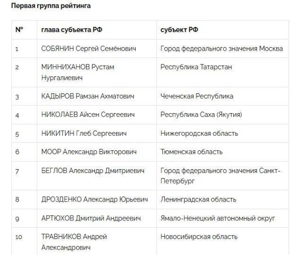 Раис Татарстана Рустам Минниханов занял второе место в национальном рейтинге глав субъектов РФ. На первом месте — мэр Москвы Сергей Собянин, на третьем — глава Чечни Рамзан Кадыров. Исследование опубликовал центр информационных коммуникаций «Рейтинг». Его результаты получены на основании заочного анкетирования, заочных и очных опросов представителей экспертного сообщества.